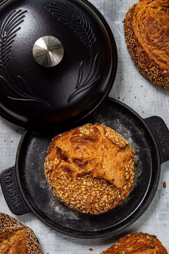 Boule en fonte émaillée avec poignées intégrées, bouton en acier inoxydable et fond plat, spécialement développée en collaboration avec Rutger Bakt pour la cuisson du pain.