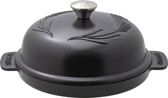La boule à pain est en fonte émaillée. La fonte retient longtemps la chaleur et assure un bon transfert de chaleur à la pâte à pain. Étant donné que la boule à pain est émaillée, elle est résistante à l'eau, ne rouille pas, est facile à nettoyer et la pâte risque moins de coller. Traditionnellement, le pain était cuit dans une poêle en fonte, le Dutch Oven, où la poêle était utilisée comme four. La boule à pain utilise les propriétés et les avantages de la fonte, mais laisse le four faire le travail. Le bouton de couvercle robuste en acier inoxydable garantit que vous pouvez facilement saisir vous-même le couvercle de la boule à pain avec des gants de cuisine. Avec l'intégré poignées, vous pouvez facilement déplacer toute la boule de cuisson du pain.
